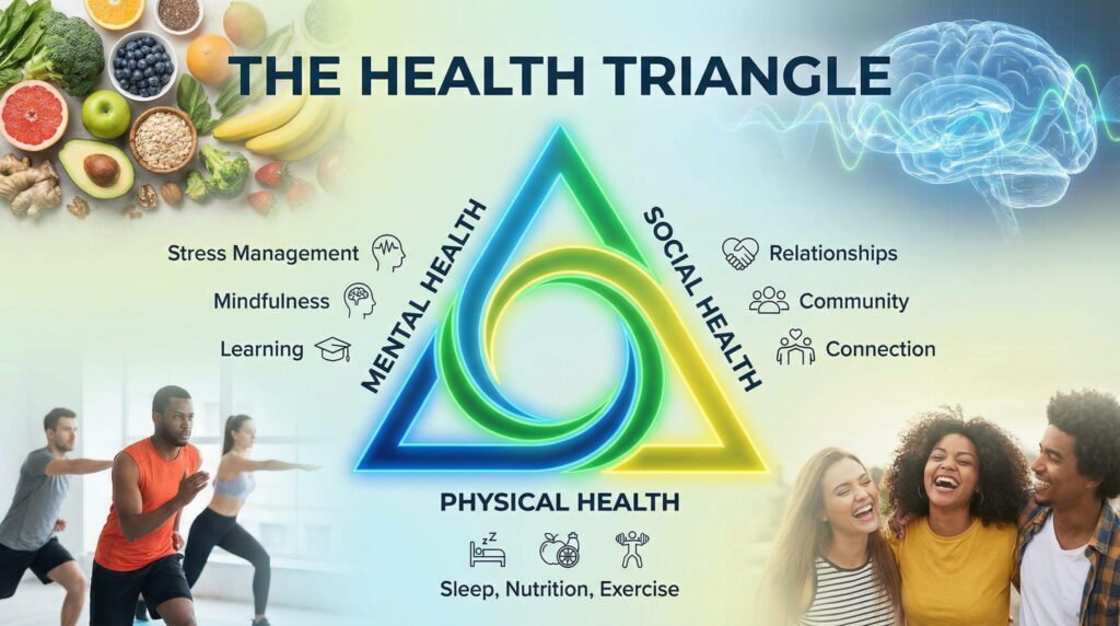 When one side of your health triangle is weak, it pulls down the others. Poor physical health (no sleep, bad diet) worsens mental health (irritability, anxiety). Weak social health (loneliness) increases stress and weakens immunity.