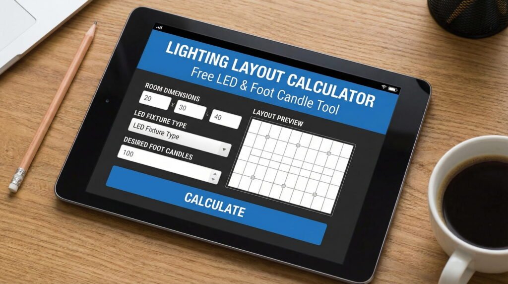 A good calculator provides fixture count, spacing, and brightness in one place. Look for tools with LED and foot candle support.